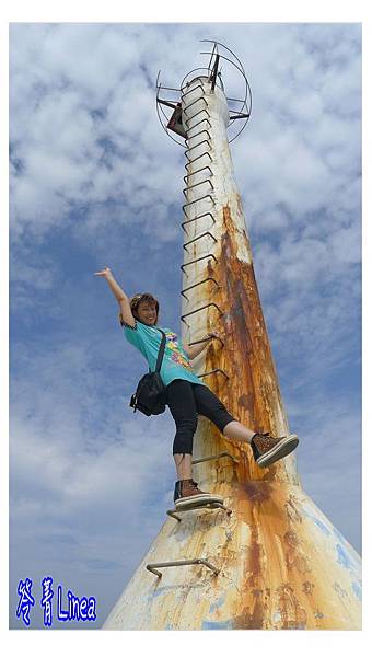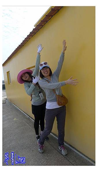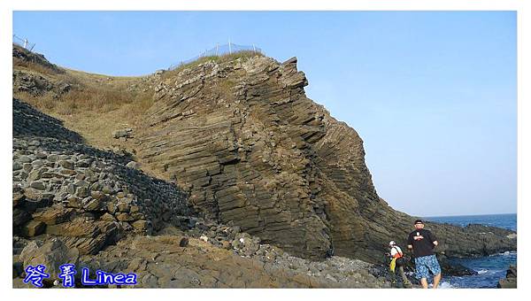 一旁還有七美超有名的玄武岩柱狀節理,這是柱火山岩區所特有的地質景觀,岩漿噴出地表或灌入岩層後,溫度逐漸降低,再冷卻收縮而形成柱狀節理,在月鯉彎邊,有個超罕見的放射狀節理,那可是壯觀景色,那邊也擺個放射狀的POSE(怎麼擺啦XDD)應該很炫!