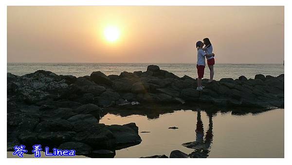 情人們站到礁石上,以落日大海為背景,讓自己成了浪漫唯美的剪影,倒映在前頭的水窪中,留下最美的記憶。