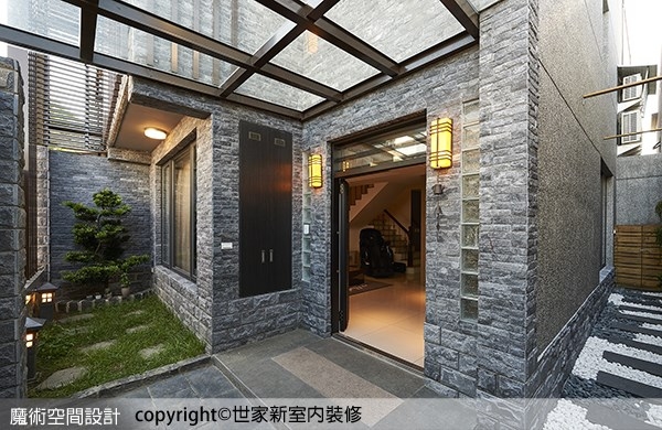 ▲透明雨遮形成迎賓天棚,主建物與圍牆間悉心規劃日式園藝造景,右側鋪滿雙色卵石及岩片步道,休閒感十足。