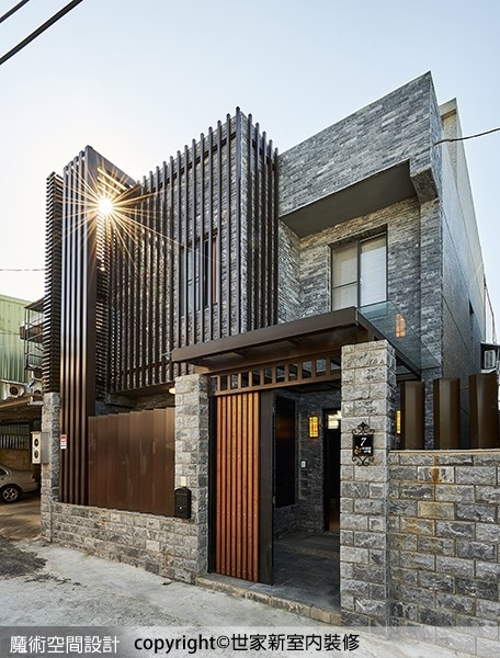 1.世家新室內設計運用大量石材與木建材,透過線條俐落的格柵與簡潔鋪面,形塑帶有日式味道的現代建築外觀,讓老屋跳脫陳舊平板風貌,重新以沉穩洗鍊的建物形象,矗立於街道。
