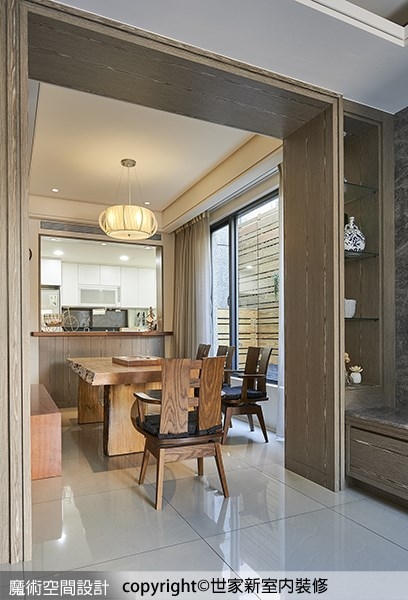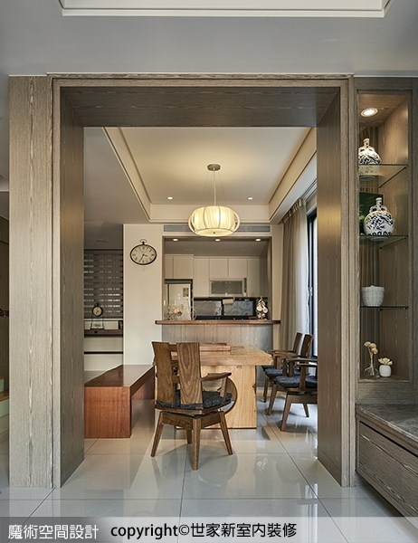 3.開放式餐廳藉由木質框架,延伸展示櫃打造俐落門拱,將場域劃分出層次感,餐廳仍保有通透空間感,也與客廳產生連結。
