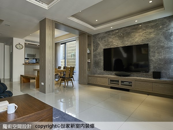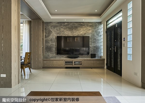▲客廳電視牆以紋理美麗的石材鋪陳,搭配簡潔的電視櫃,留出大尺度空間動線,讓長輩起居生活更流暢便利。