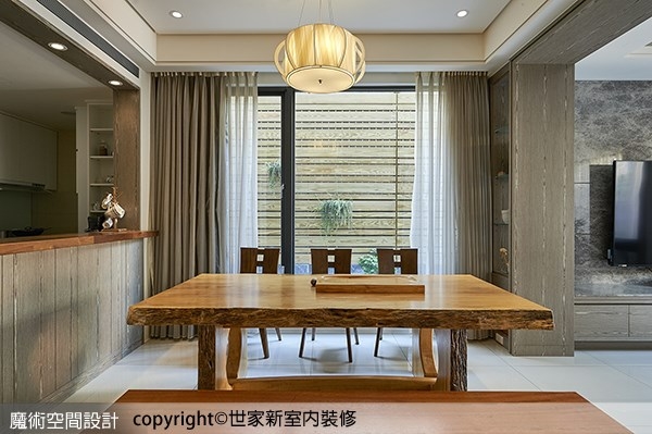4.林垚豐總監將精心營造的庭院景致留給餐廳,透過大窗攬景入室,原木厚實桌板為餐廳帶入大自然的原始氣息,讓餐敘氛圍風情無限。
