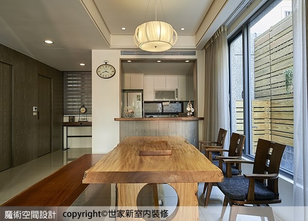 2.林垚豐總監運用木格柵圍籬打造植栽牆,也藉此建立隱私範疇,讓室內餐廳坐擁景觀而不受外界打擾,原木餐桌與吧檯,讓家人餐敘時刻增添放鬆休閒感。