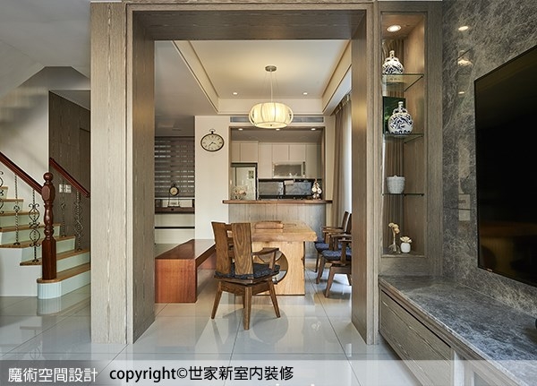 ▲進入寬闊室內,視線可直抵電視櫃旁的餐桌區,延伸展示櫃打造俐落裝飾門框,將場域劃分出層次感。