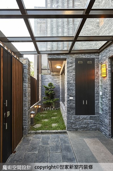 ▲舊屋翻修後的小而美日式庭院銜接入門區段,藉由地坪材質劃分微落差,將玄關區塊獨立出來。
