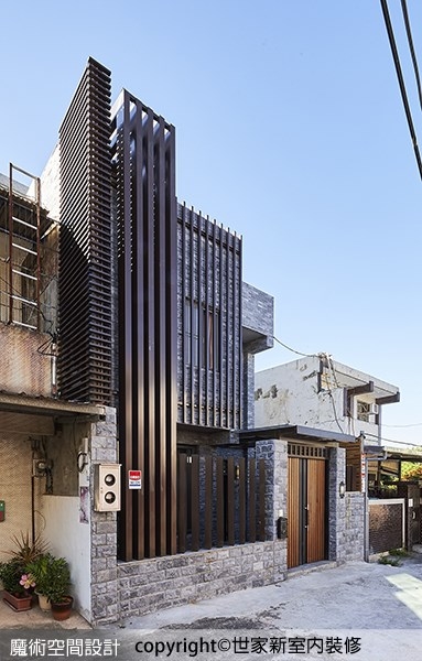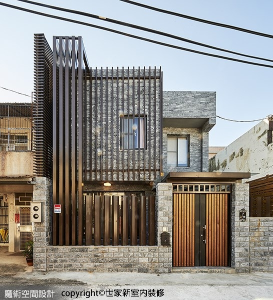 1.世家新室內設計以格柵線條與大量石材搭配,重塑透天厝舊屋翻修的外觀,深、淺灰色階,垂直、水平線條,共構出內斂而出色的外觀改造。