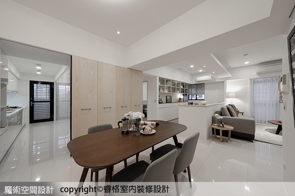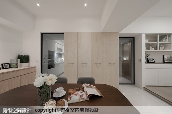 ▲完整的櫥櫃立面成功化解廚房與餐廳畸零區塊的尷尬,讓餐敘空間變得簡約俐落。