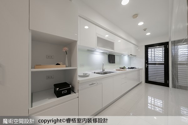 ▲陳柏宏設計師以白色打造廚房空間,顯得明亮而放大,附拖拉層的電器櫃增加使用彈性。
