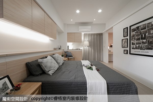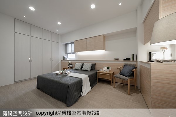 ▲主臥室需要大量的收納計畫,混合木色與白色收納櫃體,減輕量體負荷。
