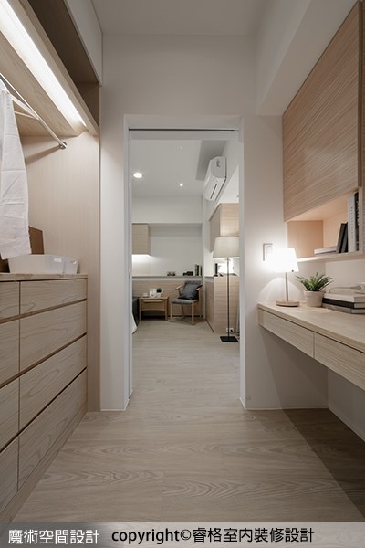 1.因應屋主居住成員改變,睿格設計陳柏宏設計師因此重塑二房間,先是在建築體結構安全無虞前提下打掉緊鄰客廳的小房間,讓客廳與書房通透為一體,放大公領域視野;再則是將夾在女兒房和主臥室之間的房間一分為二,一半作為主臥室附屬的更衣室,一半則為儲物室,充分發揮居住者實用機能功效。