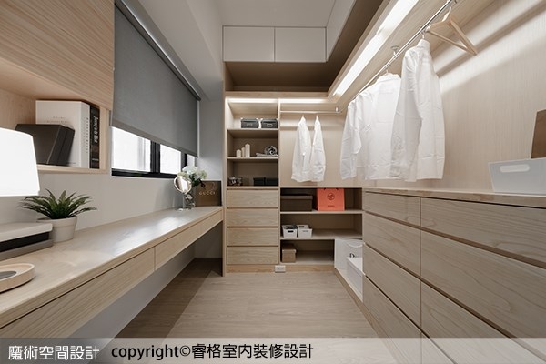 ▲陳柏宏設計師新增闢的更衣室設置有照明設備的開放式衣櫃,靠窗則為大梳妝桌。