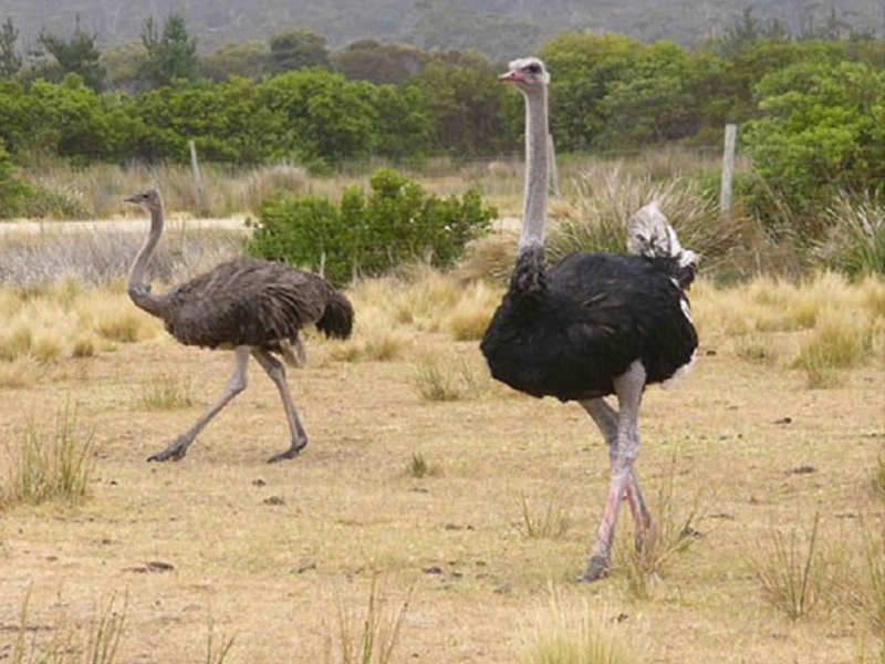 鴕鳥:世界上最大的鳥類,雄鴕鳥身高約200公分~250公分,體重約100~150公斤;雌鳥體型較小,身高約175~190公分,體重約100公斤。公的成鳥羽毛是黑白色,翅羽及尾羽為純白色,頸部羽毛稀疏近裸毛,大多數公鴕鳥頸部裸毛下緣環繞一圈白毛;母的成鳥全身羽毛多呈灰褐色。