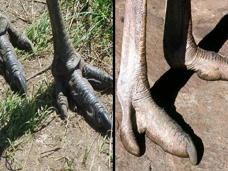 鴕鳥:後肢粗大,只有二個腳趾,與一般鳥類3~4趾不一樣,是鳥類中腳趾數量最少。後肢強而有力,除用於奔跑外,還可向前踢用以攻擊。