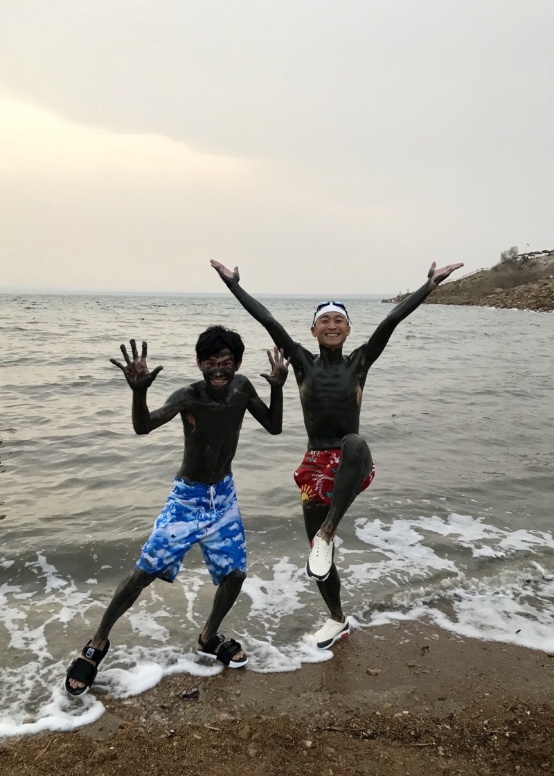 《食尚玩家》阿翔(左)、浩子全身塗滿死海泥。