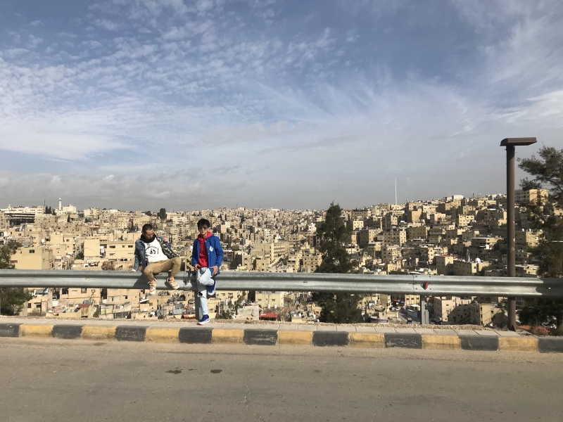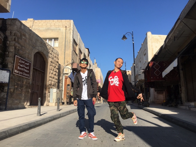 《食尚玩家》浩子(左)、阿翔在古城安曼前留影。