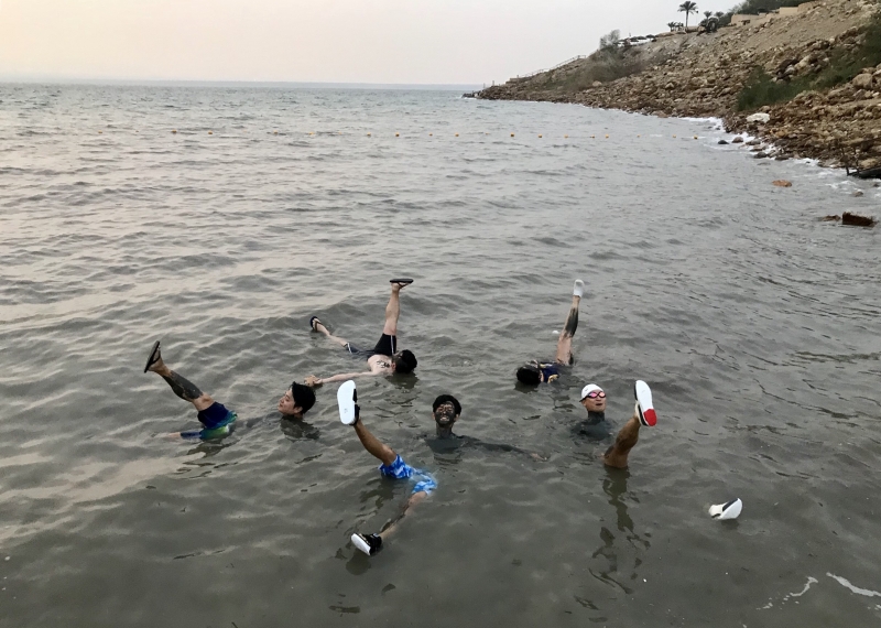 《食尚玩家》浩角翔起與工作人員在死海漂浮 玩起「死海芭蕾」。
