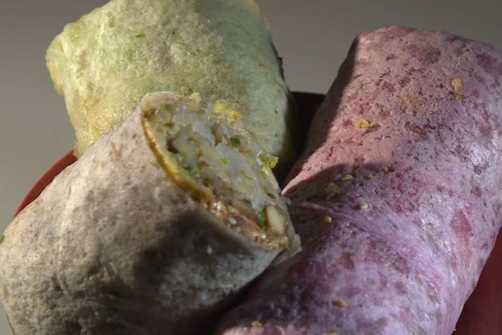 誰說潤餅皮都是白色的,少見的菠菜、火龍果潤餅,還有芝麻口味,讓潤餅好繽紛,大口咬下,清脆蔬菜融合鹹香紅燒肉,花生粉的甜爬上舌尖,滿滿餡料,讓重量級潤餅,一個就超過半公斤。