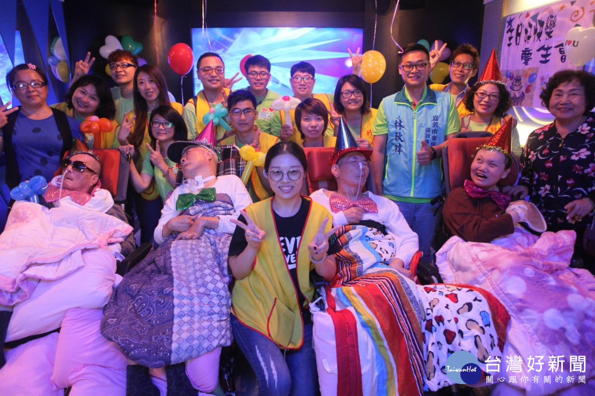 到KTV唱歌是我們的日常,也是植物人受傷前的娛樂;在他們不幸成為植物人後,創世除了安養照顧,也期待讓他們融入社區,擁有適切的休閒日常。透過資源連結,4月2日(一)上午10點,富邦人壽嘉勝通訊處蕭詳凜處經理與20位夥伴,帶植物人阿發、阿祥、阿盛及淑瑜到歌神KTV唱歌開趴踢。一行人從安養院出發,雖短短500公尺路花了一般人2倍的時間,但沿途經過人聲鼎沸的菜市場、車水馬龍的大路口、香味四溢的小吃攤,進到KTV還有閃爍的霓虹燈和富邦夥伴創意的包廂佈置,及震耳的音樂聲,大家一起歡唱,氣氛超high,整個行程院民目光炯炯有神,顯得相當興奮。