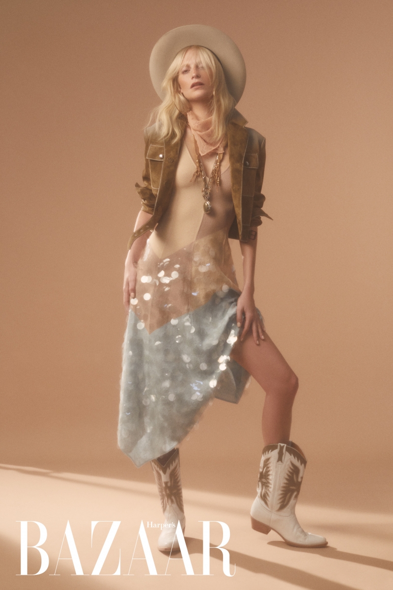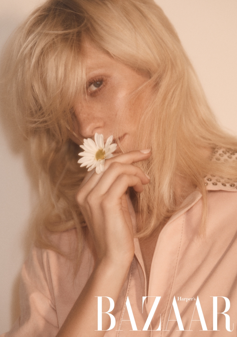 但是在拍攝BAZAAR Taiwan封面的這一天,她隻身來到我們位於紐約的攝影棚,進來時身邊沒有經紀人和助理。有禮而絲毫沒有嬌氣,還帶著一股率性。她任化妝師在眉毛掃下淡淡的金色,穿上Bottega Veneta一襲略帶華麗搖滾、卻刻意降低彩度的洋裝,「我喜歡這種蒼白的色調。」當她用英國腔這樣說的時候,聽起來格外的性感。此時的Poppy 讓我們想起她在《金牌特務2:機密對決》裡那個出現在音樂祭的關鍵角色。在電影裡,Poppy邀請男主角到她在Glastonbury的帳篷,並在男主角耳邊輕語:「在Glastonbury發生的事,就留在Glastonbury吧!」這是Poppy 轉戰電影後第一個讓人印象深刻的角色。身為名模,她那古典冷豔的氣質已是鮮明標誌,但作為演員,她的故事才正要開始。