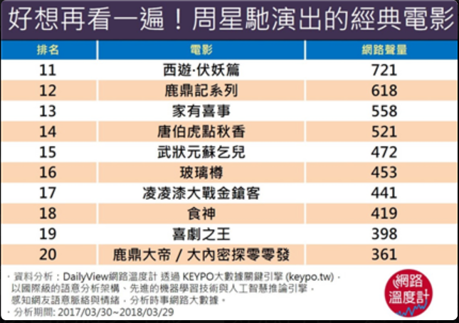 今日DailyView網路溫度計透過《KEYPO網路大數據》從2017年3月30日到2018年3月29日間觀察網友的討論串,星爺演出的電影作品不計其數,但是最受歡迎的是哪10部呢?