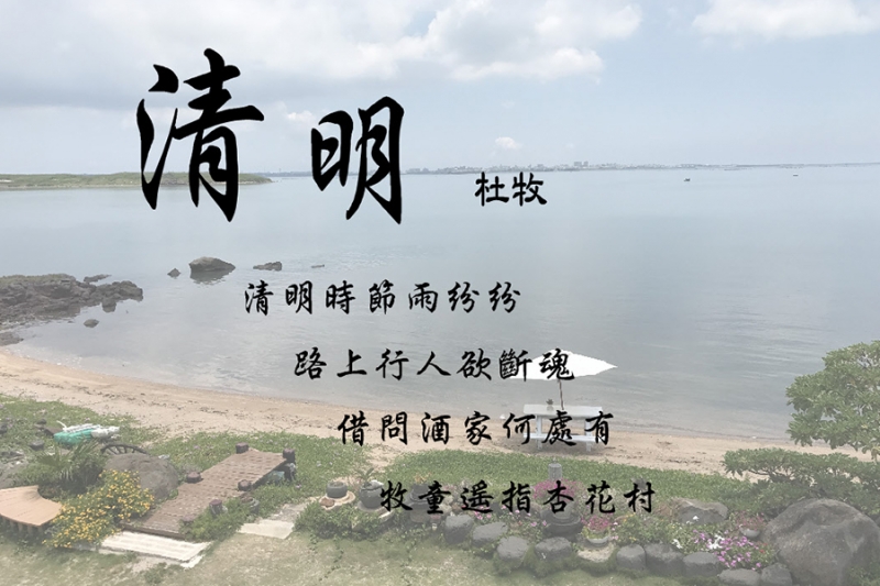 「清明時節雨紛紛,路上行人欲斷魂。借問酒家何處有?牧童遙指杏花村」。每到清明節,心中都會自然默唸起這首詩句(唐代詩人杜牧《清明》),現代人只關心清明節放假,但漸漸忘了這節日所代表的意義。首先從24節氣說起,24節氣包括十二個中氣和十二個節氣,根據太陽在黃道(太陽一年裡在恆星間或天球劃過的軌道稱為黃道)上的位置,把一年劃分為24個彼此相等的段落,也就是把黃道分成24個等份,每等份各佔黃經15℃。所以「清明」節氣大約會落在國曆4月4日或5日,此節氣代表的意義是天氣晴朗溫暖,植物冒新芽,農民忙於春耕,萬物甦醒,一切生氣勃勃。二十四節氣中,「清明」是民俗節日也是氣象節氣。