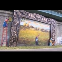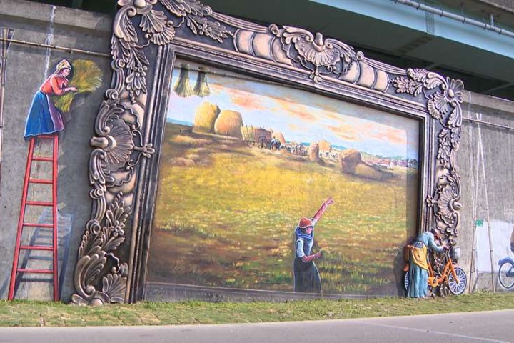 金色麥田裡,遠處農人忙著收割,一名拾穗婦人卻振臂一揮,率領「姐妹們」,騎單車破框而出。這一幅Kuso名畫《拾穗》的巨型壁畫,出現在大漢溪新北流域右岸,精緻裱框就像掛在堤防邊上。
