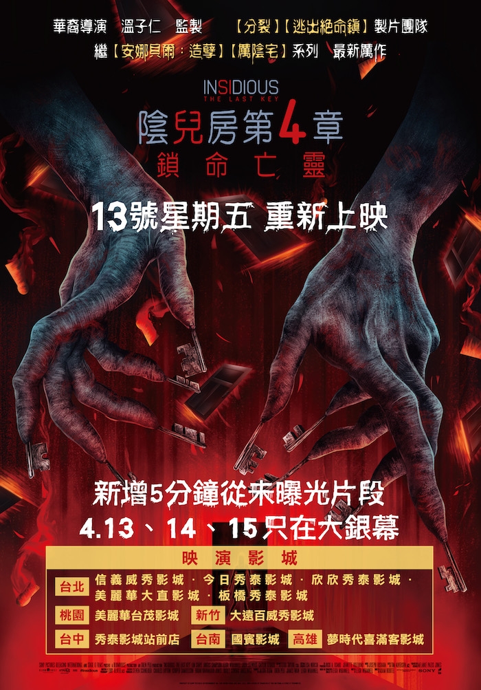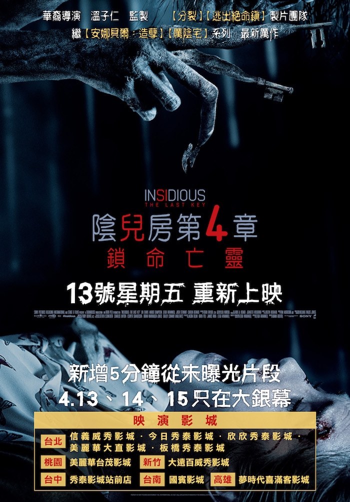 電影【陰兒房第4章:鎖命亡靈】將於本週4月13日至4月15日,限時三天於限定影城重新上映,且電影中更新增未公開過的全新5分鐘片段。上映之指定影城為:信義威秀影城、今日秀泰影城、欣欣秀泰影城、美麗華大直影城、板橋秀泰影城、美麗華台茂影城、新竹大遠百威秀影城、台中秀泰影城站前店、台南國賓影城、高雄夢時代喜滿客影城,詳細資訊請洽各影城官方網站。