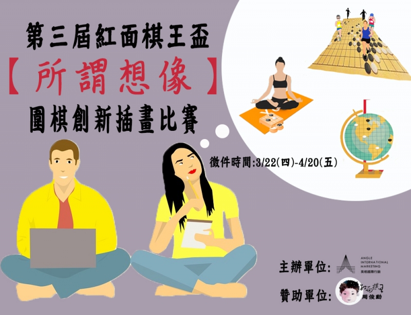 AlphaGo 帶給圍棋圈最大省思為「創新」,傳統既有的規則一一被擊破,墨守成規已不符合時代的變遷,唯有改變及創新才能擦出新的火花,本屆紅面棋王盃圍棋創新插畫比賽即以[所謂想像]為主題,邀請大家腦力激盪,圍棋可以怎麼玩?可以如何變化?棋子可以是彩色的嗎?或許你曾在心中想過下出一盤另人驚喜的棋局,也或許你不會下棋但曾想像圍棋在生活上的不同呈現,更或是想創造一副全新意象的棋具等等,只要與圍棋相關,皆歡迎投稿!