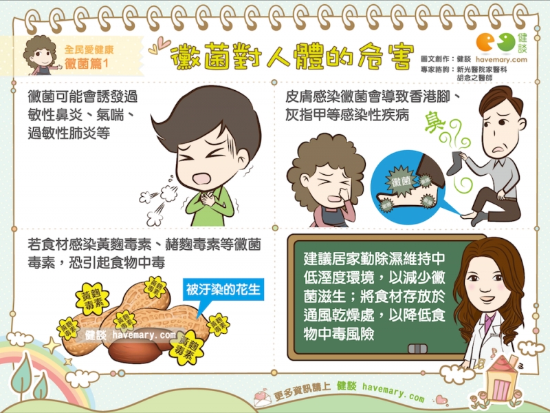 梅雨季節即將到來,潮濕的環境容易滋生黴菌,不僅會讓食物、物品發霉,且黴菌也可能會附著在人體上,到底黴菌對人體的危害有哪些呢?新光醫院家醫科胡念之醫師表示,黴菌對人體的影響不僅是皮膚疾病而已,也可能誘發氣喘、過敏等問題,甚至引起食物中毒的可能,提醒大家留意盡量保持環境低溼度、並將食品存放於通風乾燥處,以減少黴菌滋生喔!