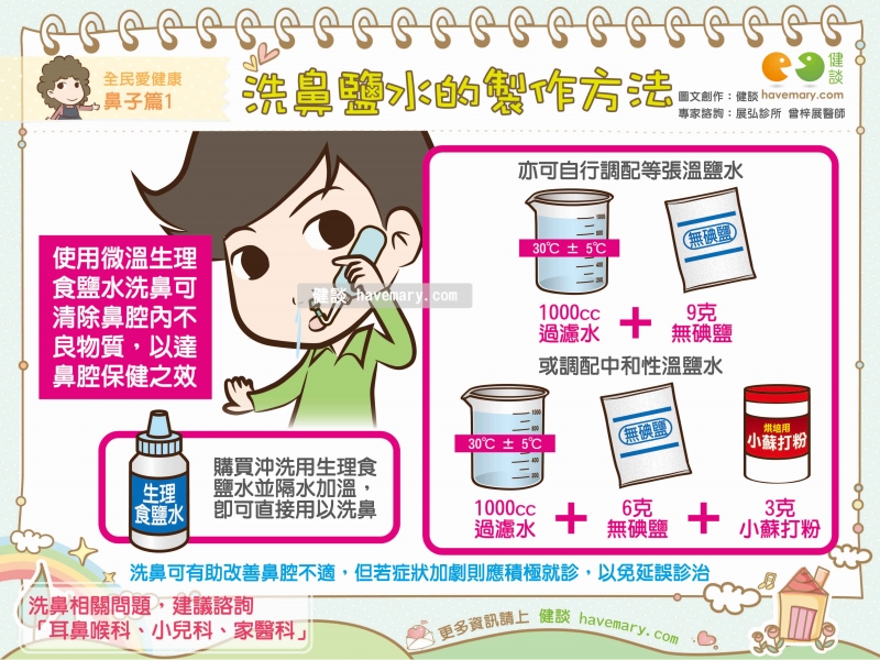 若想自行調配等張溫鹽水,只要將1000cc的過濾水搭配9克的無碘鹽即可,或是採用中和性鹽水來洗鼻,以1000cc的水搭配6克無碘鹽及3克小蘇打,混合均勻即可。