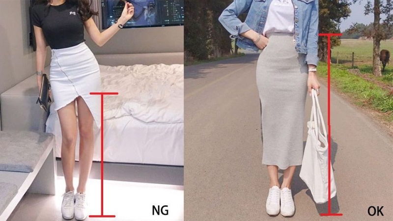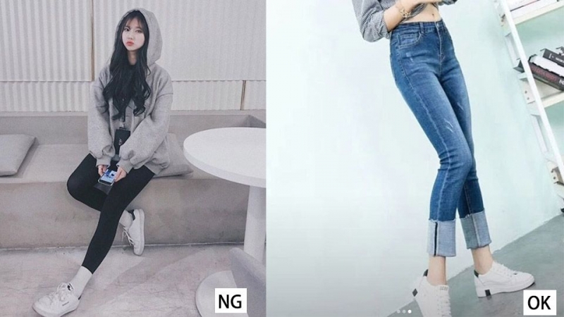 當我們穿膝蓋以上的短版下身時,就不建議穿隱形襪搭配小白鞋,這樣的搭法會讓人覺得:腳被截斷了,因為腿變成是從露出來的地方開始算,因此,小編建議可以選擇長版的下身,腿部就會從褲頭的位子開始算,視覺上變成「大長腿」!(見上圖)