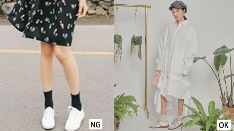 這個NG搭配法尤其忌諱像小編這種說白不算白,但也不到健康膚色的「尷尬膚色地帶」族群,如果腿型又不夠美,那麼「色差」過大的搭配,會讓腿整個變短!(上圖左)什麼是色差過大呢?就是「深色襪子」配小白鞋,因此,襪子的部分可以挑選淺色系、白色系,抑或是很適合夏天穿的白色透膚蕾絲款!