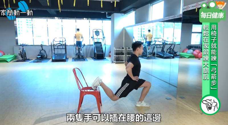 Dennis 教練指出,弓箭步可以刺激大腿肌群,首先背對椅子,右腳單腳踩在椅子上,兩腳保持一前一後,軀幹維持直立,前腳膝蓋彎曲吸氣向下、吐氣往上,感覺肌肉有緊繃、前腳有吃力感為準。