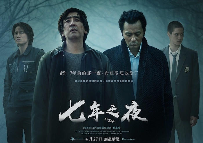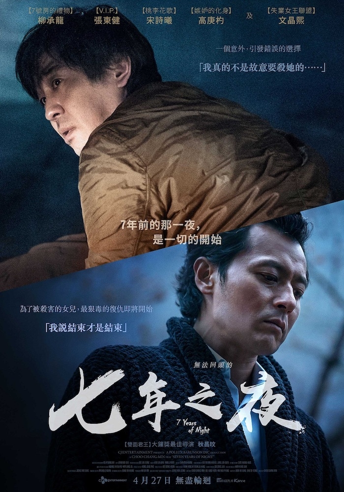 電影《七年之夜》描述水壩村世靈湖,新到任的警衛賢洙(柳承龍 飾),在察看員工宿舍與任職環境時,不慎意外撞死當地仕紳吳英齊(張東健 飾)的女兒,慌亂之下,賢洙竟將遺體丟棄於湖中。英齊尋覓查訪真相,得知賢洙是罪魁禍首,決心要復仇,以牙還牙。賢洙因為負罪感過著生不如死的生活,但為了兒子瑞元,他要守護摯愛,只有誓死對抗英齊的狠毒復仇。電影《七年之夜》將於4月27日在台上映。