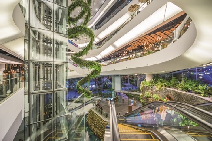 The EmQuartier分3個區域,分別是左側的The Helix、右側的The Glass及最內側的The Waterfall Quartier,三棟外觀風格迥異,大量的玻璃帷幕與落地窗,大膽的螺旋狀空間結構,打破樓層的制式,加上流暢線條造型,新潮的設計讓人眼睛。
