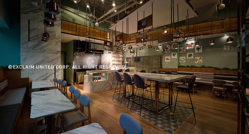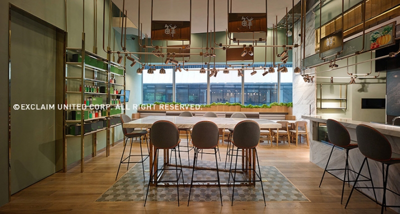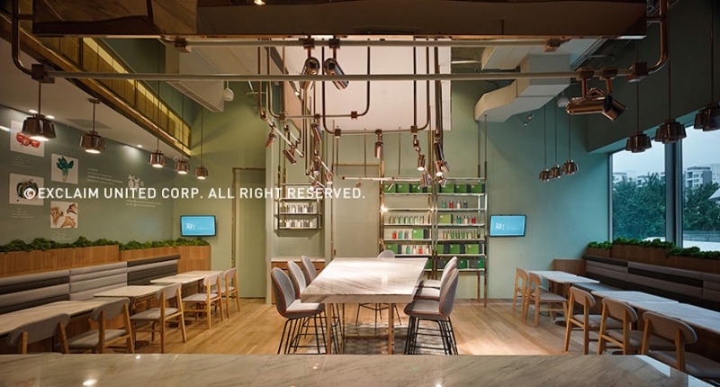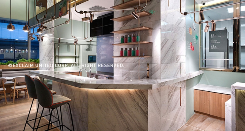 色彩學上標準的中性色是冰冷的灰色,而自然界的中性色是青草般的綠色;設計師將清晰純粹的青草綠作為空間基礎色調,不僅是主牆面的選色,搭配環繞整個空間的豐富植栽,並透過窗戶引入綠意盎然的天然景致,結合開闊的動線設計,共同營造出爽朗舒適、自然獨特的餐飲空間,傳達出業主注重健康與生活品味的理念。