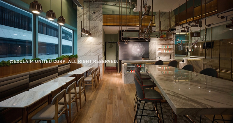 餐飲區以溫潤的木料與石材作為裝潢主體,營造出低調奢華的氣息,精簡流暢的動線將室內劃分成三種不同類型的座位區,分別招待不同人數的團體客與散客;三種不同樣式的桌子皆以白色拋光石材製成,不論是精緻的方桌、厚實的長桌,或者是與樑柱融為一體的吧檯,在特製燈具的照耀下,共同為室內增添典雅氣質。