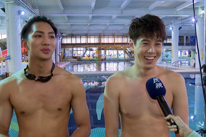 明杰狼狽的狗爬式,對比吳東諺俐落的蝶泳,連劇組人員都忍不住笑出來。兩個新生代男星,拍戲較勁,從演技比到泳技,也算難得一見。
