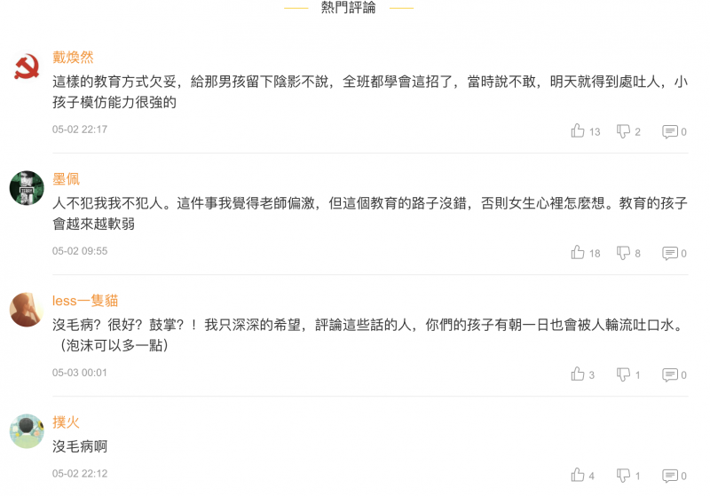 但也有人覺得這樣反而會引起模仿效應,就有網友提到:「這樣的教育方式欠妥,給那男孩留下陰影不說,全班都學會這招了,當時說不敢,明天就得到處吐人,小孩子模仿能力很強的」