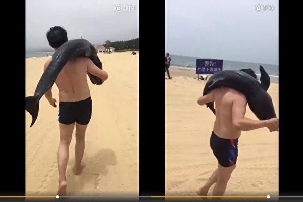 竟然發生這樣的事情,根據5月2日於秒拍上yj惜缘發表的秒拍視頻,在廣東省陽江海陵島一名外地遊客到海裡抓了一條疑似擱淺的海豚,然後直接扛上肩帶走!