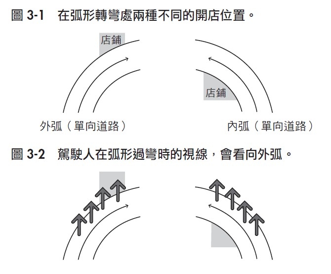 另一方面,即使將店開在內弧處,因為視線會往弧形外側移動,所以會一直看著前方車道,結果就是很難發現店家。如果店家位於從右往左轉彎的道路內環處(如圖3-2右圖),雖然駕駛人可以正面看見店家,但往往看見位於內弧的店家時,已經來不及停車了。