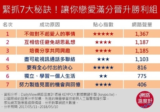 除了給你看失敗原因,DailyView網路溫度計也透過《KEYPO大數據關鍵引擎》來看看網友們討論遠距離戀愛修成正果的關鍵妙計,希望每對遠距戀人都能幸福快樂!