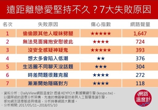 今日DailyView網路溫度計透過《KEYPO網路大數據》從2017年5月11日到2018年5月10日間觀察網友在臉書討論、PTT與各新聞媒體、討論區的留言,整理出網友認為遠距離會失敗的原因以及成功的祕訣!
