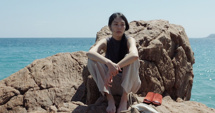 ▲金珉禧光腳坐在坎城海邊的石頭上,顯得孤獨憂傷。