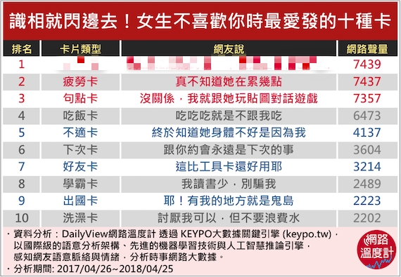 所以DailyView網路溫度計今日特別透過《KEYPO大數據關鍵引擎》調查,告訴你女生拒絕男生時最愛發的十種卡,讓各位善男在氣氛僵掉前下台一鞠躬。