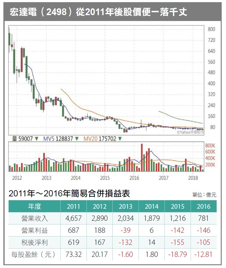 2011年宏達電因為HTC智慧手機的熱賣創下每股純盈73.32元的歷史高峰後,緊接著伴隨而來的,是如同雪崩般的衰退,不管你是從營收、毛利,還是淨利的角度來看,全部節節敗退;2012年∼2015年的EPS為20.17、-1.60、1.80、-18.79、-12.81,這樣的獲利表現是無法支撐原先的高股價,價格呈現崩跌,幾乎是可以預期的事。