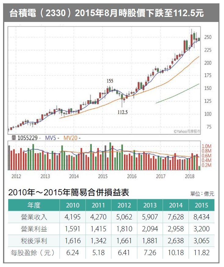 2015年3月台積電(2330)股價來到155元創波段高點,但隨著全球景氣復甦力道不如預期,加權指數從萬點一路下修至7,203點,身為台股市值最大的台積電自然也無法倖免,股價一口氣跌掉快3成,股價最低來到112.5元。這個時候你要做的,不是跟著大家瘋狂殺出持股,而是應該要趁別人恐慌時,進場撿便宜。