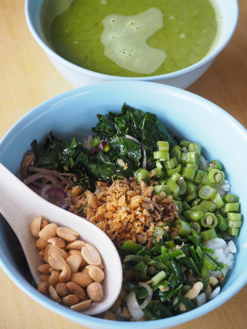 白飯需用碗公裝盛,碗公不能裝滿,大概裝七分就好,選用碗公是因為既可以鋪滿配菜,還可以留餘裕給注入的茶湯,白飯等量鋪上各式配菜,一樣一樣像鋪草皮似的,再搭配一碗茶湯,就是一套擂茶餐。它的吃法很隨興,吃法一是「乾濕分離」,吃一口飯、喝一口湯;吃法二是「先乾後濕」,先吃乾飯與配菜,半途再把茶湯倒入飯中變成茶泡飯;吃法三是﹁茶泡飯﹂,把茶湯直接倒入飯中吃飯湯。無論哪一種吃法都非常好吃,加入了油蔥酥、花生或蝦米碎,不僅增加油脂量,也拉升了口感跟鮮鹹的立體感,每一種食材在口中分別咀嚼,像是認識不同食材的不同個性,合在一起吃又集苦、甘、鹹、香、甜於一身,茶湯裡的蔬菜多數燙炒過,不帶生野的草腥味,吃完腸胃很舒服。