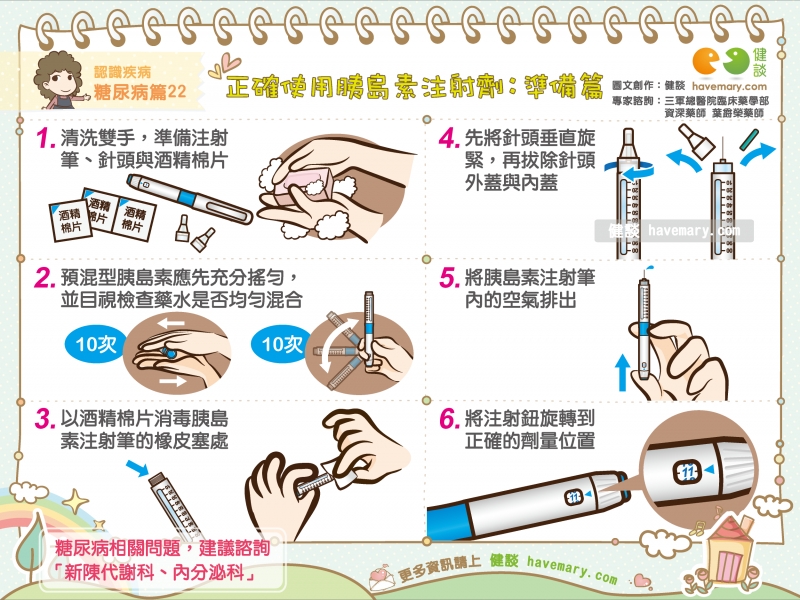 健談整理居家胰島素注射的幾項重要觀念,本篇「正確使用胰島素注射劑:準備篇」將先針對使用胰島素注射劑前應做好的6項準備工作進行說明: